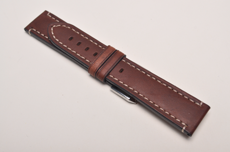 Wykonany ze skóry cielęcej w wyprawie roślinnej. Gładki, matowy. Przeszyty białą nicią. Pogrubiany na całej długości do 4mm. Dwie szlufki, stalowa klamerka.