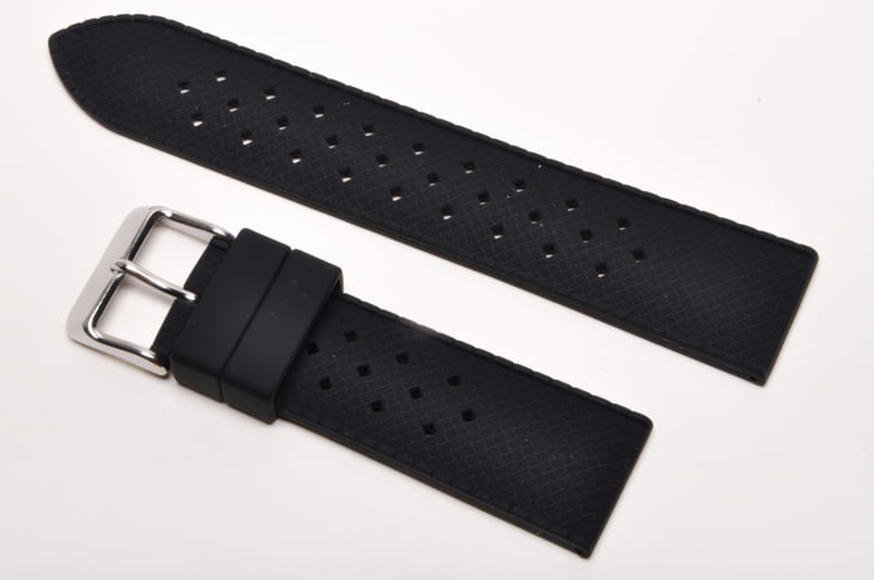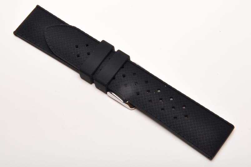 Pasek wykonany z wysokiej jakości silikonu o gumowym chwycie. Drobny wzór plecionki, perforowany typowo dla pasków tropuic. Stalowa klamerka, dwie szlufki.