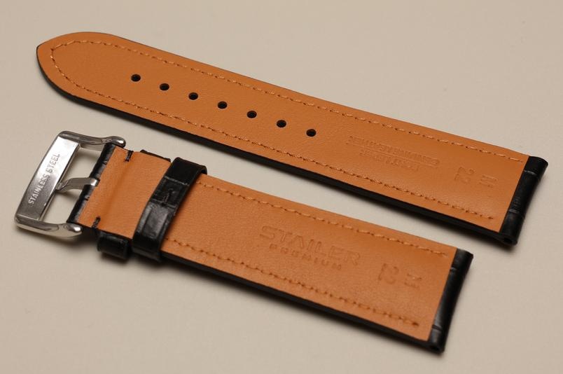 Wykonany ze skóry cielęcej wyprawianej roślinnie, z lekkim połyskiem. Wzór skóry aligatora. Miękka, gładka, futrówka Zermatt. Przeszyty nicią pod kolor paska. Grubość od 6mm przy zegarku łagodnie przechodzaca do 3mm. Dwie szlufki, piękna, stalowa, antyalergiczna klamerka ze stali 316L.