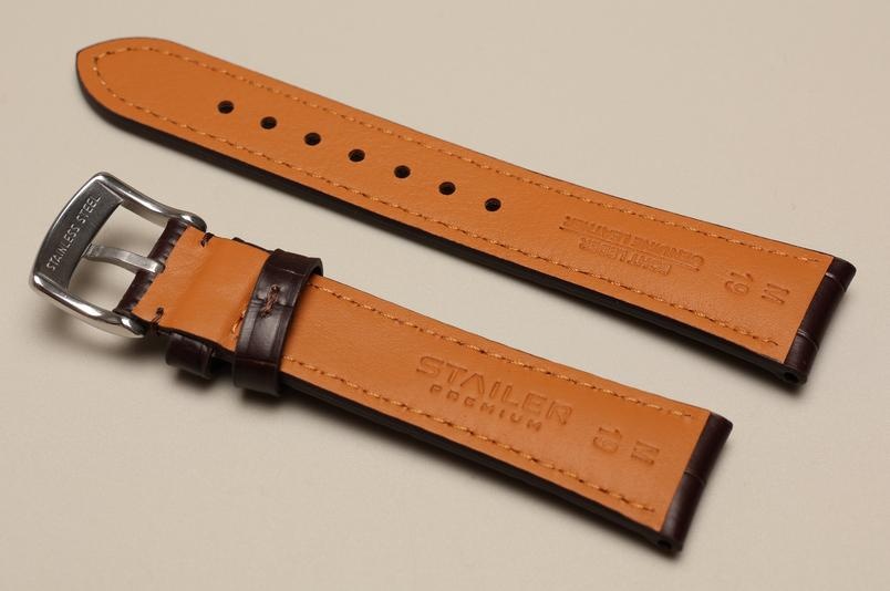 Wykonany ze skóry cielęcej wyprawianej roślinnie, z lekkim połyskiem. Wzór skóry aligatora. Miękka, gładka, futrówka Zermatt. Przeszyty nicią pod kolor paska. Grubość od 6mm przy zegarku łagodnie przechodzaca do 3mm. Dwie szlufki, piękna, stalowa, antyalergiczna klamerka ze stali 316L.