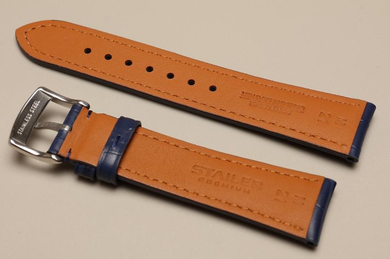Wykonany ze skóry cielęcej wyprawianej roślinnie, z lekkim połyskiem. Wzór skóry aligatora. Miękka, gładka, futrówka Zermatt. Przeszyty nicią pod kolor paska. Grubość od 6mm przy zegarku łagodnie przechodzaca do 3mm. Dwie szlufki, piękna, stalowa, antyalergiczna klamerka ze stali 316L.