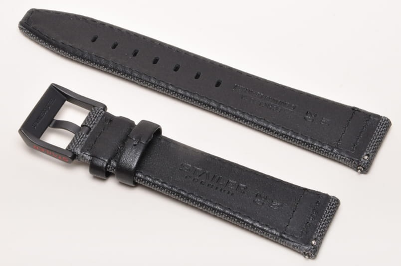 Wykonany z materiału Cordura, futrówka z czarnej, licowej skóry. Przeszyty nicią w kolorze paska. Dwie szlufki, stalowa klamerka. Wbudowane szybkie teleskopy.