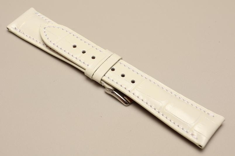 Wykonany ze skóry cielęcej, z połyskiem. Wzór skóry aligatora. Miękka, gładka, futrówka Zermatt. Przeszyty nicią pod kolor paska. Grubość od 5mm przy zegarku łagodnie przechodzaca do 2,5mm. Dwie szlufki, piękna, stalowa, antyalergiczna klamerka ze stali 316L.