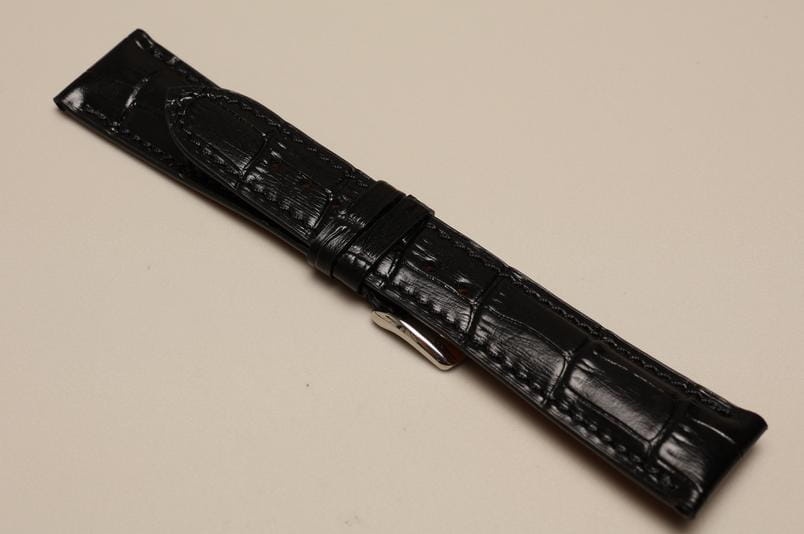 Wykonany ze skóry cielęcej, z połyskiem. Wzór skóry aligatora. Miękka, gładka, futrówka Zermatt. Przeszyty nicią pod kolor paska. Grubość od 5mm przy zegarku łagodnie przechodzaca do 2,5mm. Dwie szlufki, piękna, stalowa, antyalergiczna klamerka ze stali 316L.