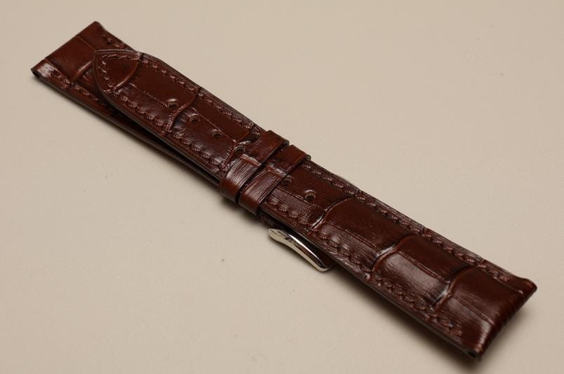 Wykonany ze skóry cielęcej, z połyskiem. Wzór skóry aligatora. Miękka, gładka, futrówka Zermatt. Przeszyty nicią pod kolor paska. Grubość od 5mm przy zegarku łagodnie przechodzaca do 2,5mm. Dwie szlufki, piękna, stalowa, antyalergiczna klamerka ze stali 316L.