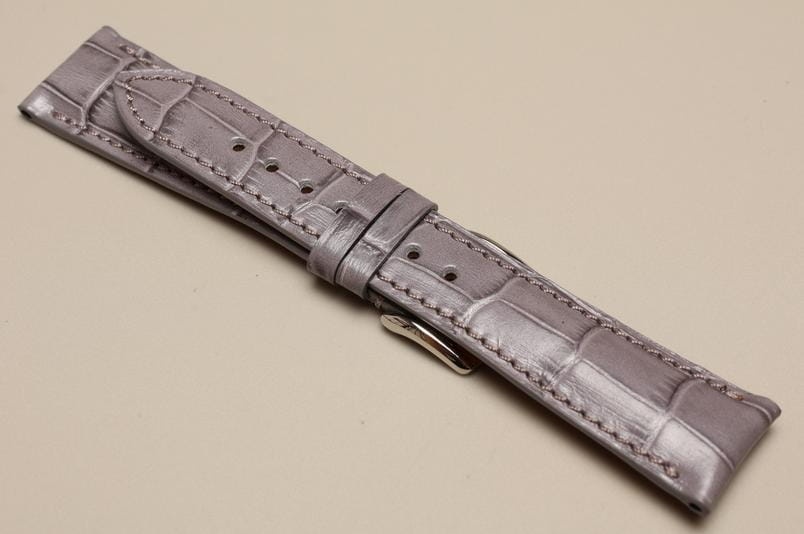 Wykonany ze skóry cielęcej, z połyskiem. Wzór skóry aligatora. Miękka, gładka, futrówka Zermatt. Przeszyty nicią pod kolor paska. Grubość od 5mm przy zegarku łagodnie przechodzaca do 2,5mm. Dwie szlufki, piękna, stalowa, antyalergiczna klamerka ze stali 316L.