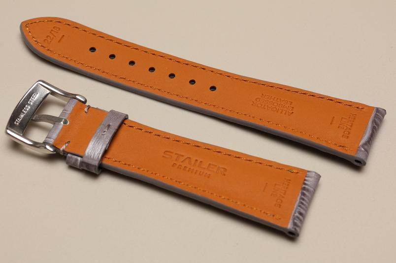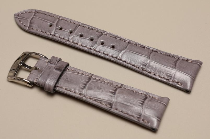 Wykonany ze skóry cielęcej, z połyskiem. Wzór skóry aligatora. Miękka, gładka, futrówka Zermatt. Przeszyty nicią pod kolor paska. Grubość od 5mm przy zegarku łagodnie przechodzaca do 2,5mm. Dwie szlufki, piękna, stalowa, antyalergiczna klamerka ze stali 316L.