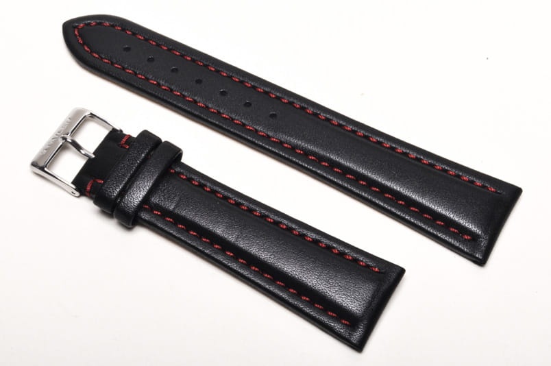 Wykonany ze skóry cielęcej, z delikatną fakturą i połyskiem. Przeszyty czerwoną nicią. Pogrubiany przy mocowaniu, dalej cieniowany. Dwie szlufki, stalowa klamerka. Wersja XL.