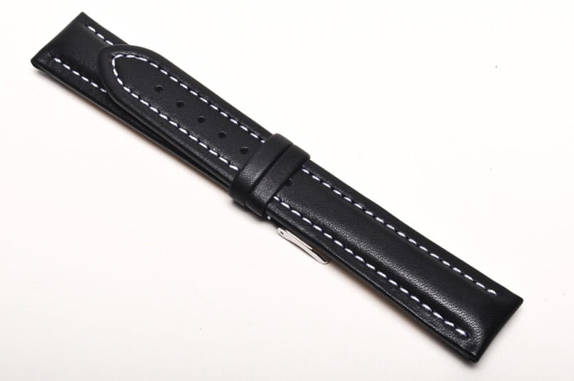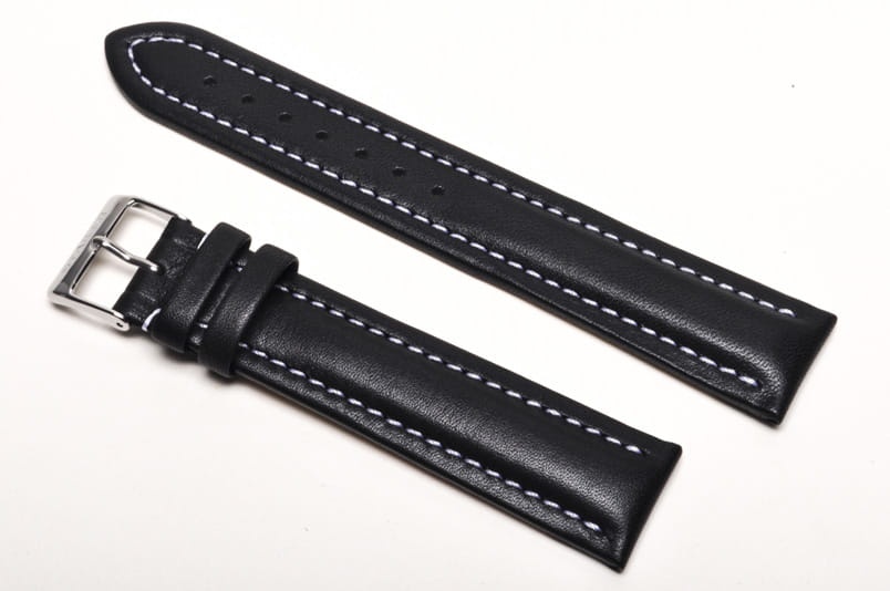 Wykonany ze skóry cielęcej, z delikatną fakturą i połyskiem. Przeszyty białą nicią. Pogrubiany przy mocowaniu, dalej cieniowany. Dwie szlufki, stalowa klamerka. Wersja XL