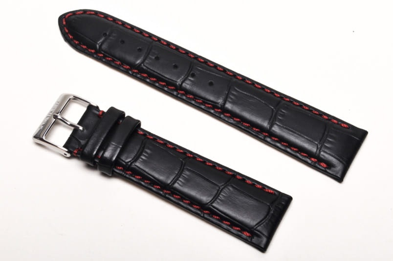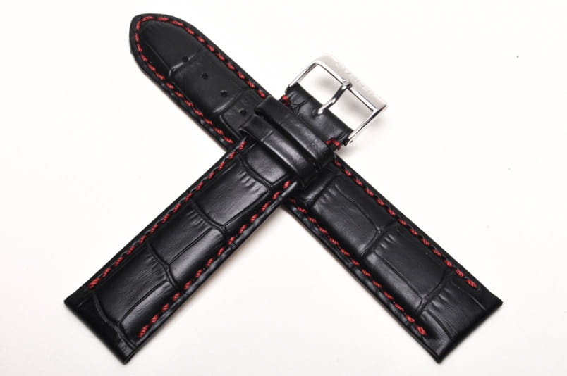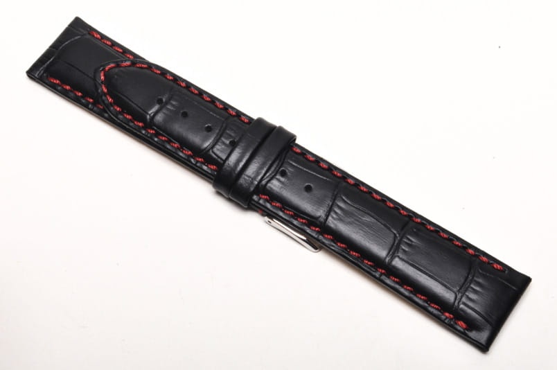 Wykonany ze skóry cielęcej, tłoczonej na wzór skóry aligatora. Przeszyty czerwoną nicią. Lekko pogrubiany. Dwie szlufki, stalowa klamerka.