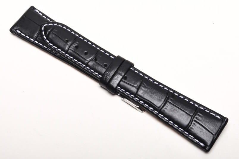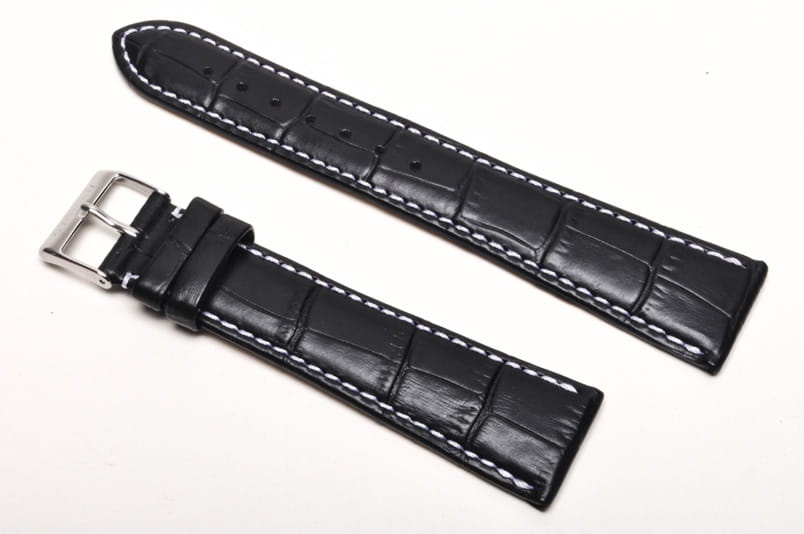 Wykonany ze skóry cielęcej, tłoczonej na wzór skóry aligatora. Przeszyty białą nicią. Lekko pogrubiany. Dwie szlufki, stalowa klamerka. Wersja XL.