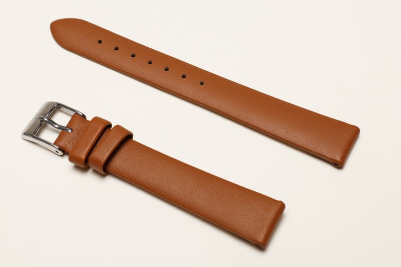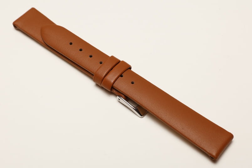 Wykonany ze skóry cielęcej, gładki, płaski, bez szycia. Dwie szlufki, stalowa klamerka.