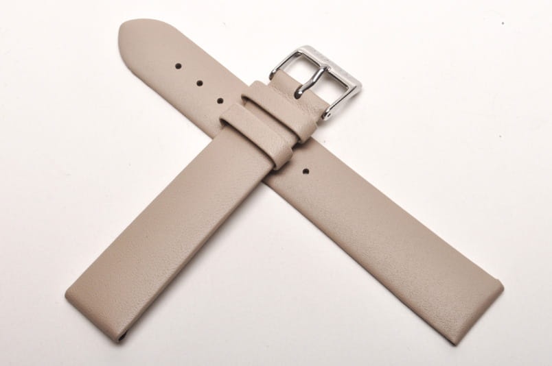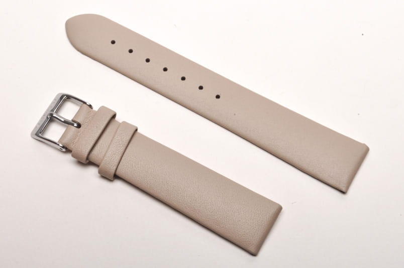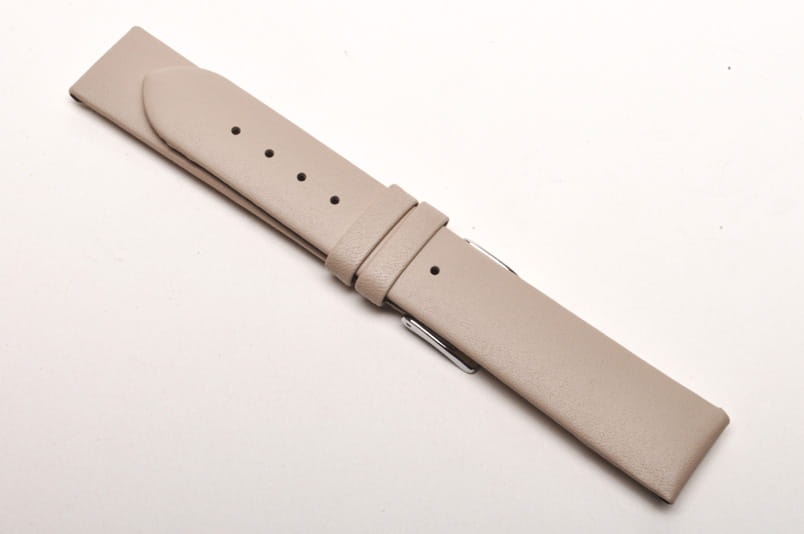Wykonany ze skóry cielęcej, gładki, płaski, bez szycia. Dwie szlufki, stalowa klamerka.