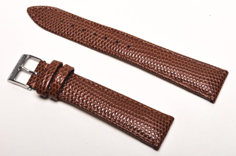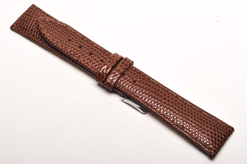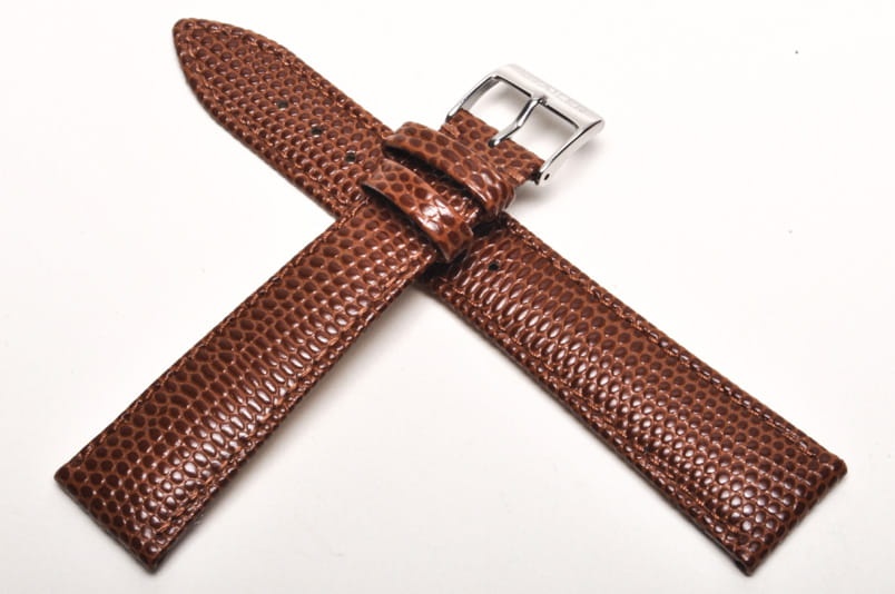 Wykonany ze skóry naturalnej, tłoczonej na wzór skóry jaszczurki. Przeszyty nicią pod kolor paska. Delikatnie pogrubiany. Dwie szlufki, stalowa klamerka.