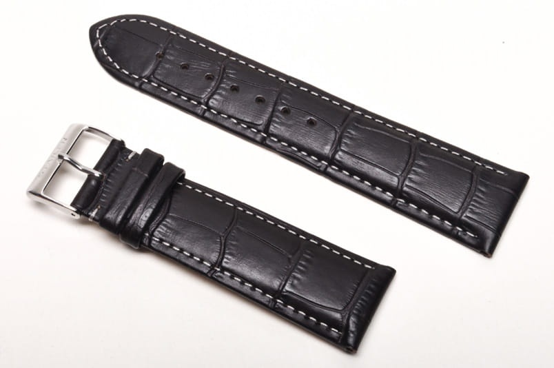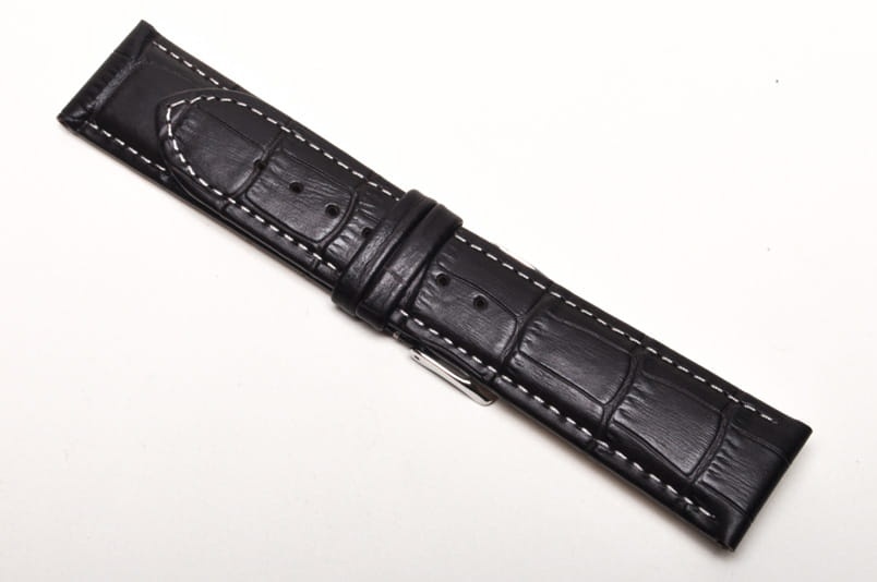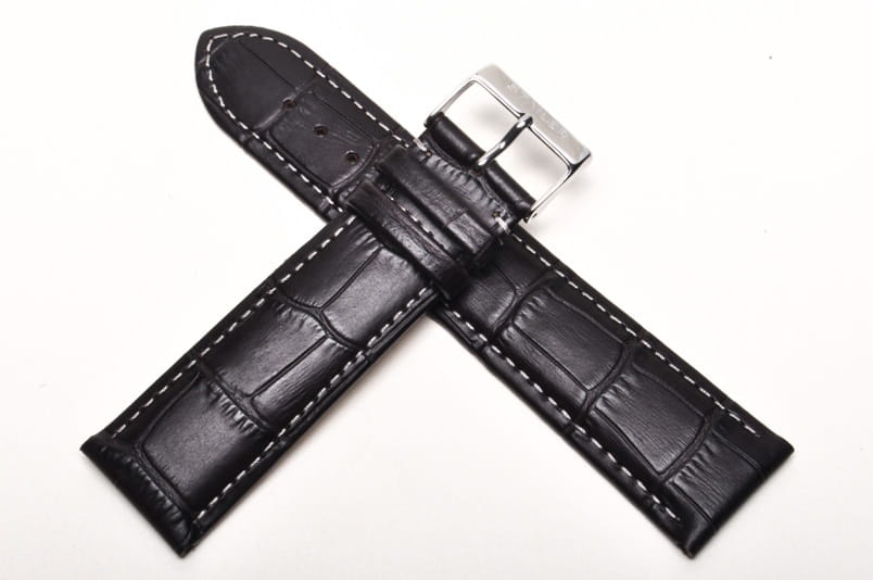 Wykonany ze skóry naturalnej, tłoczonej na wzór skóry aligatora. Przeszyty białą nicią. Delikatnie pogrubiany. Dwie szlufki, stalowa klamerka.