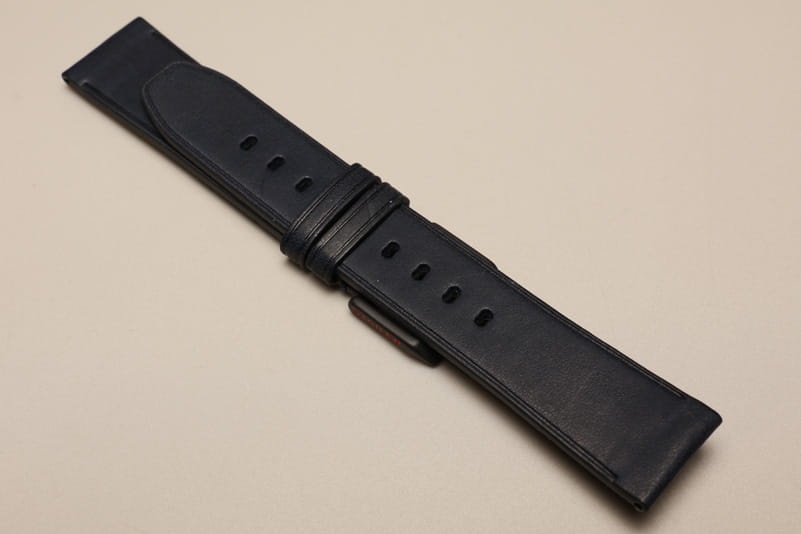 Wykonany z najwyższej jakości skóry licowej (genuine full grain) . Matowy, gładki, z delikatnym ozdobnym tłoczeniem naokoło . Wzmacniające przeszycie przy klamerce.