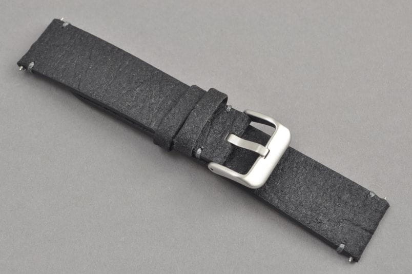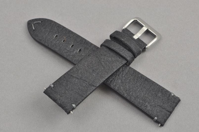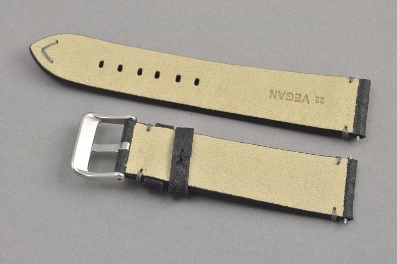 Wierzch paska wykonany z materiału Piñatex® - skóropodobnej tkaniny z włókien ananasowych. Futrówka z tworzywa imitującego skórę. Naturalna, lekko chropowata faktura. Płasko pogrubiany pasek z ozdobnymi pętelkami przy obu końcach. Stalowa klamerka, podwójna szlufka. Produkt wegański.