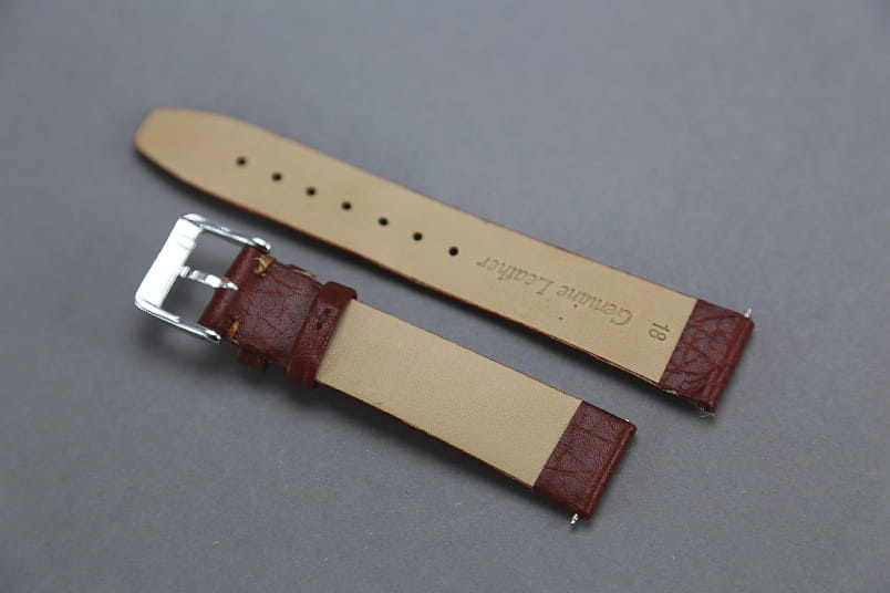 Pasek do zegarków z mocowaniem 18mm. Wykonany z naturalnej skóry, widoczny delikatny wzór byczej skóry. Klejony, gładki, dość miękki pasek. Grubość od strony zegarka 3,5mm, dalej 3,00mm. Stalowa klamerka, podwójna szlufka.