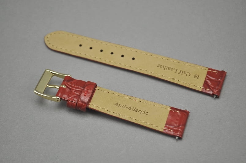 Pasek z naturalnej skóry, imitacja skóry krokodyla. Szerokość mocowania 20mm. W kolorze czerwonym, z delikatnym połyskiem. Miękki i elegancki. Cienki, (2,2mm) przeszyty nicią w kolorze paska. Idealny do klasycznych, cienkich zegarków(np. Tissot goldrun, Longines grande classique). Podwójna szlufka. Stalowa klamerka.