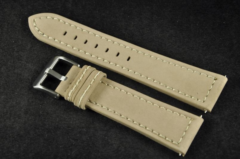 Skórzany pasek wykonany ze skóry typu zamsz. Przyszyty jasną nicią. Pogrubiany na płasko do 4,5mm przy zegarku, dalej cieniowany do 3mm. Podwójna szlufka, stalowa klamerka. Pasek o lekko wojskowym, surowym charakterze.