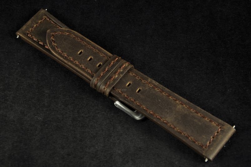 Skórzany pasek wykonany ze skóry typu zamsz. Przyszyty ciemną nicią. Pogrubiany na płasko do 4,5mm przy zegarku, dalej cieniowany do 3mm. Podwójna szlufka, stalowa klamerka. Pasek o lekko wojskowym, surowym charakterze.