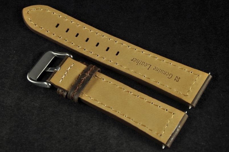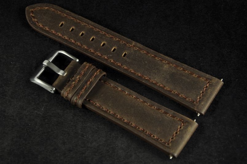 Skórzany pasek wykonany ze skóry typu zamsz. Przyszyty ciemną nicią. Pogrubiany na płasko do 4,5mm przy zegarku, dalej cieniowany do 3mm. Podwójna szlufka, stalowa klamerka. Pasek o lekko wojskowym, surowym charakterze.