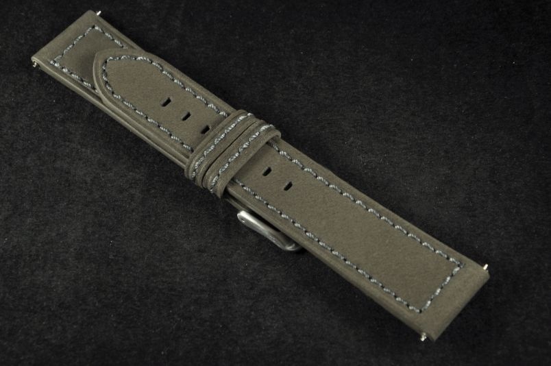 Skórzany pasek wykonany ze skóry typu zamsz. Przyszyty szarą nicią. Pogrubiany na płasko do 4,5mm przy zegarku, dalej cieniowany do 3mm. Podwójna szlufka, stalowa klamerka. Pasek o lekko wojskowym, surowym charakterze.