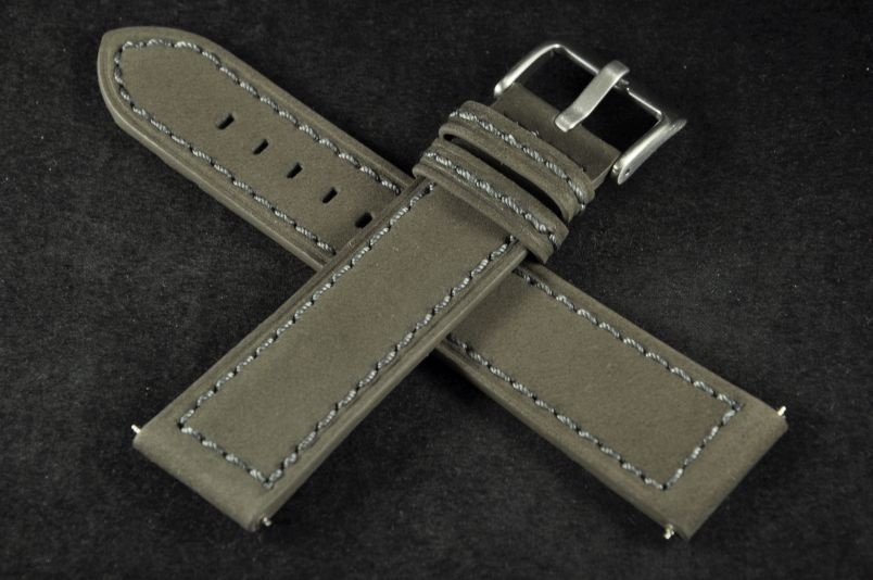 Skórzany pasek wykonany ze skóry typu zamsz. Przyszyty szarą nicią. Pogrubiany na płasko do 4,5mm przy zegarku, dalej cieniowany do 3mm. Podwójna szlufka, stalowa klamerka. Pasek o lekko wojskowym, surowym charakterze.
