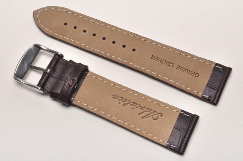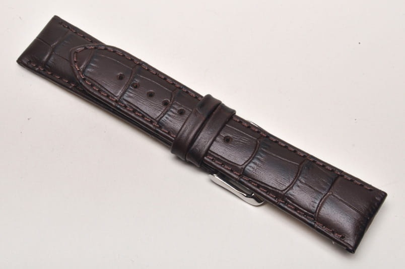 Wykonany z naturalnej skóry, w kolorze ciemnego brązu. Faktura skóry aligatora, przeszyty nicią w kolorze paska. Pogrubiany od 5mm do 3,5mm.