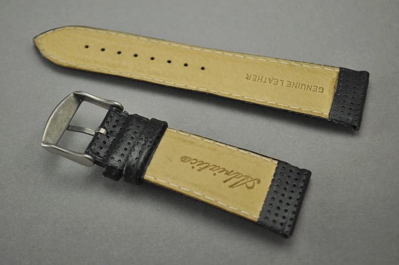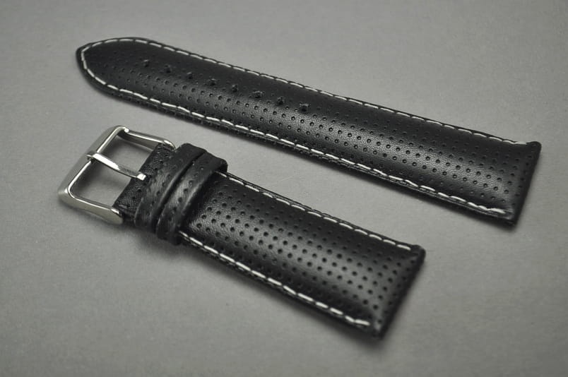 Wykonany z naturalnej skóry, w kolorze czarnym. Z delikatnym wzorem kropek na całej powierzchni .Pogrubiony od 6mm do 4,5mm na końcu. Przeszyty białą nicią. Klamerka stalowa z logo.