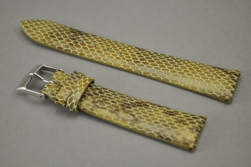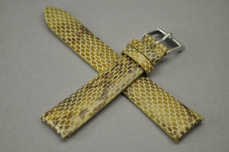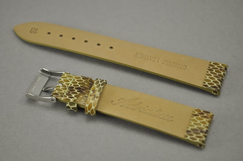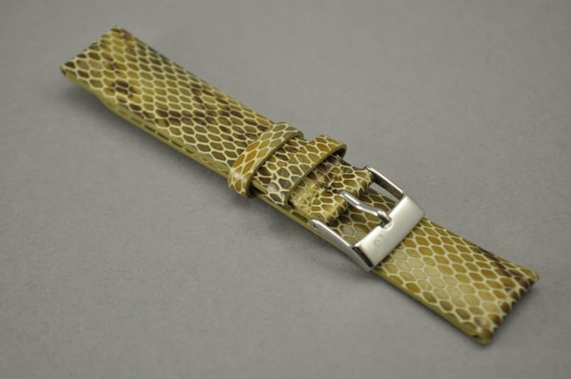 Wykonany z naturalnej skóry, w kolorze złotobrązowym. Gładki, klejony bez szwów. Półpołysk, wzór skóry węża. Podwójna szlufka, stalowa klamerka z logo.