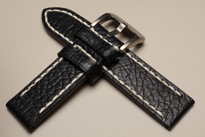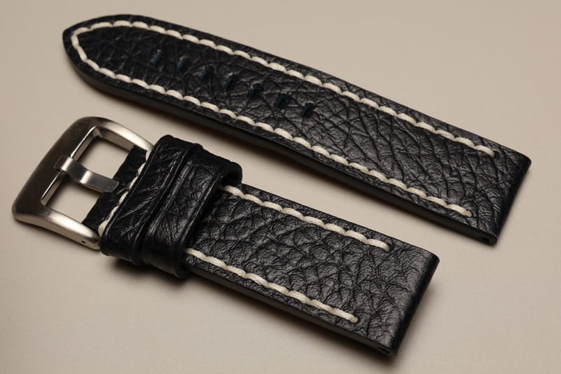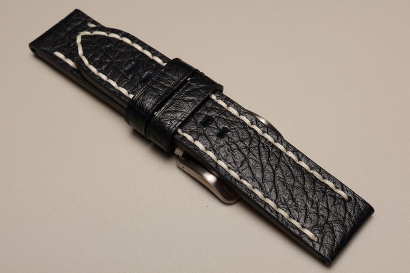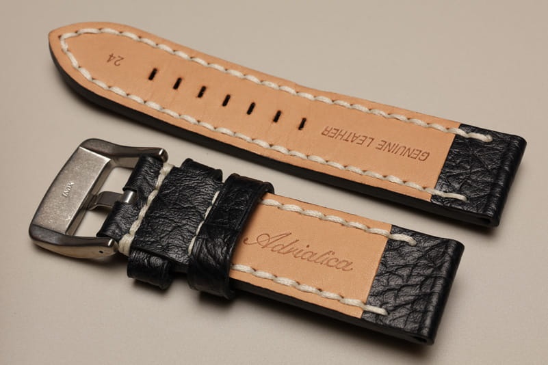 Wykonany z naturalnej skóry, w kolorze czarnym. Przeszyty białą nicią. Masywny pasek, na całej długości ma 4mm grubości. Pasuje do zegarków typu "pilot" oraz sportowych. Stalowa klamerka, podwójna szlufka.