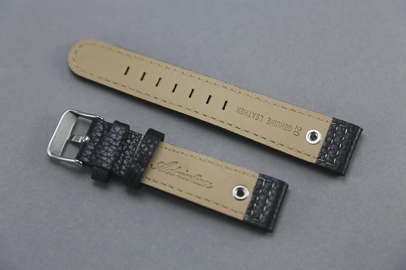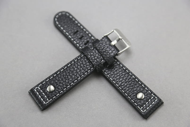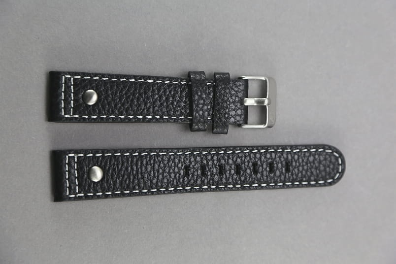 Wykonany z naturalnej skóry, imitującej byczą, w kolorze czarnym. Naokoło ozdobne białe przeszycie. Od strony teleskopów ozdobny nit. Płaski, grubość 4mm. Zaokrąglony koniec części z dziurkami. Pasuje do zegarków typu "pilot" oraz sportowych. Stalowa klamerka, podwójna szlufka.