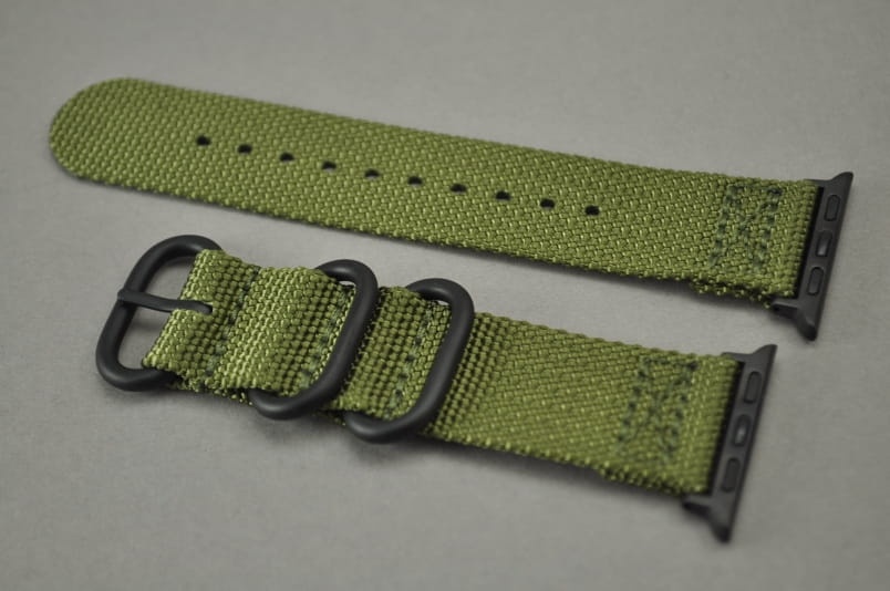 Pasek typu Zulu, dwuczęściowy. Wykonany z nylonowego, miękkiego materiału. Przeszyty na końcach nicią w kolorze paska. Stalowe, zaokrąglone, masywne szlufki w kolorze czarnym. Stalowa klamerka mocowana na stałe. Pasuje do zegarków Apple watch- 42mm lub 38mm-adapter do wyboru.