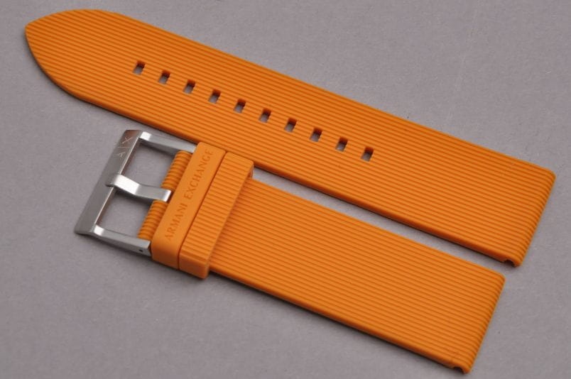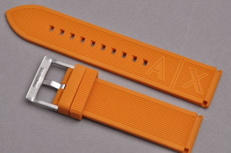 Oryginalny pasek do zegarka Armani Exchange. Wykonany z miękkiego silikonu. Delikatnie żłobiony wzdłuż. Stalowa klamerka, podwójna szlufka. W komplecie teleskopy mocujące.