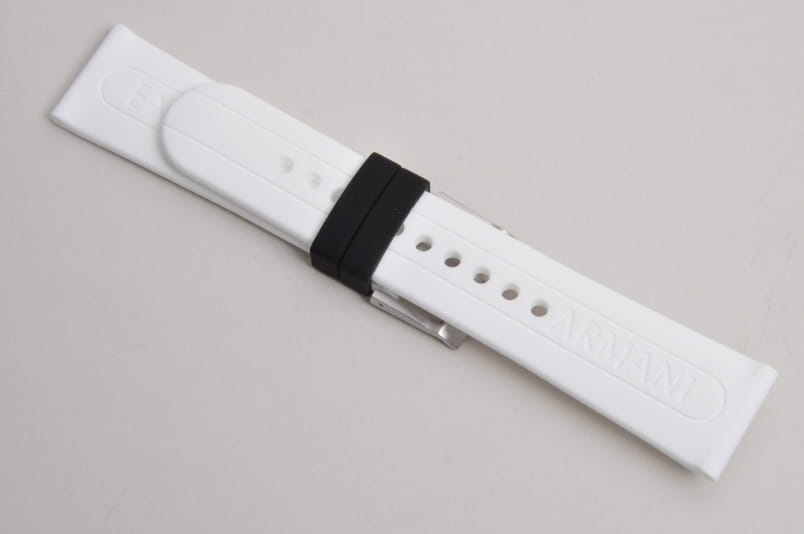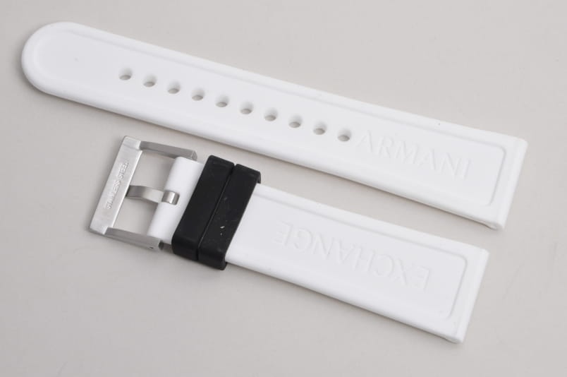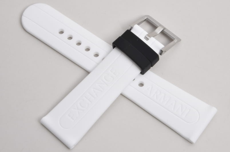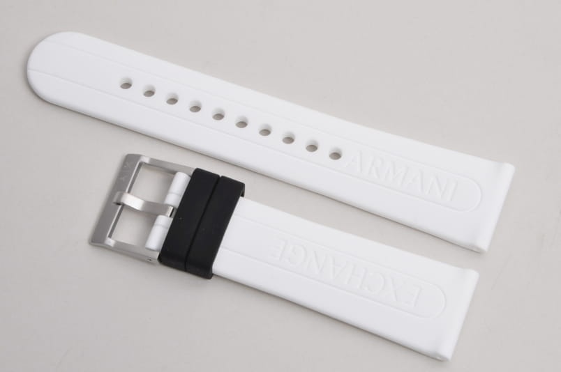 Oryginalny pasek do zegarka Armani Exchange. Wykonany z miękkiego silikonu. Delikatnie żłobiony wzdłuż. Stalowa klamerka, podwójna szlufka w kolorze czarnym. W komplecie teleskopy mocujące.