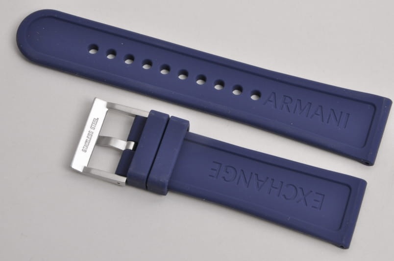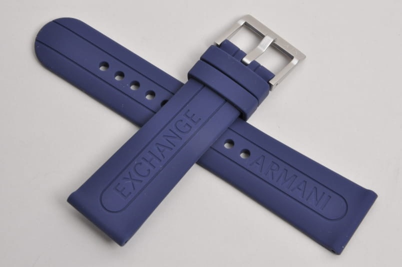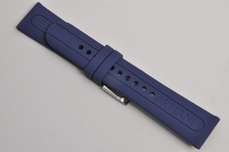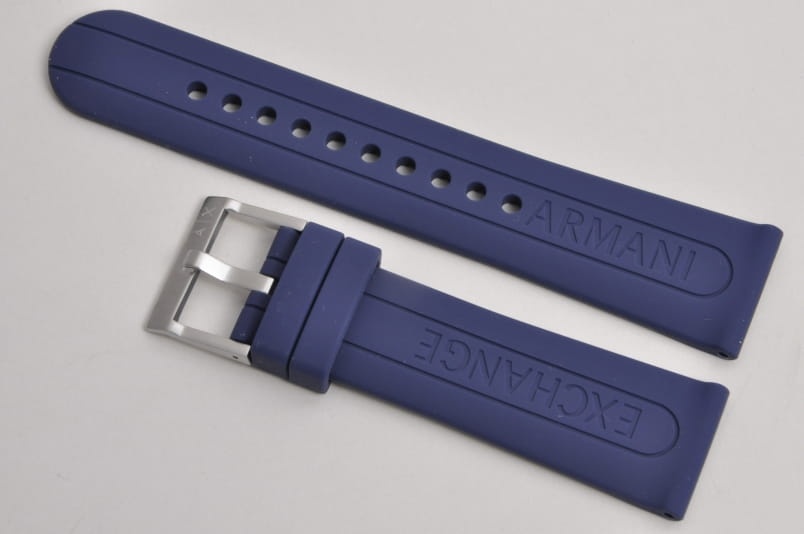 Oryginalny pasek do zegarka Armani Exchange. Wykonany z miękkiego silikonu. Delikatnie żłobiony wzdłuż. Stalowa klamerka, podwójna szlufka. W komplecie teleskopy mocujące.