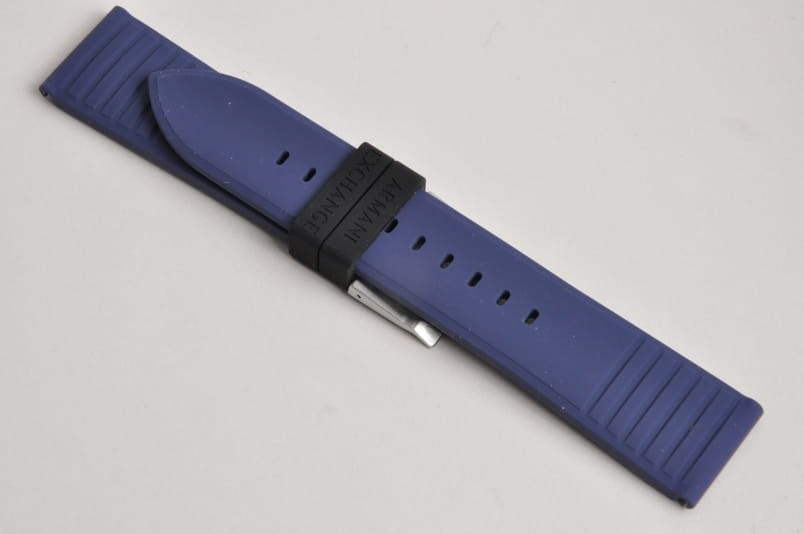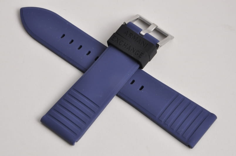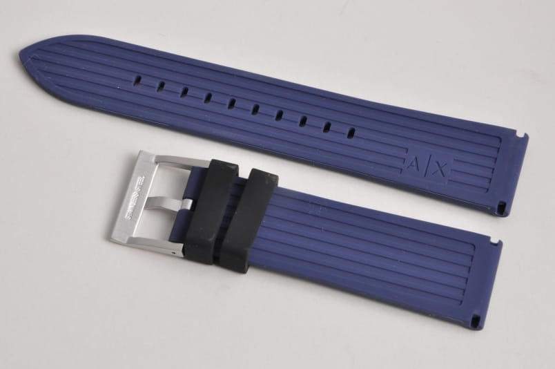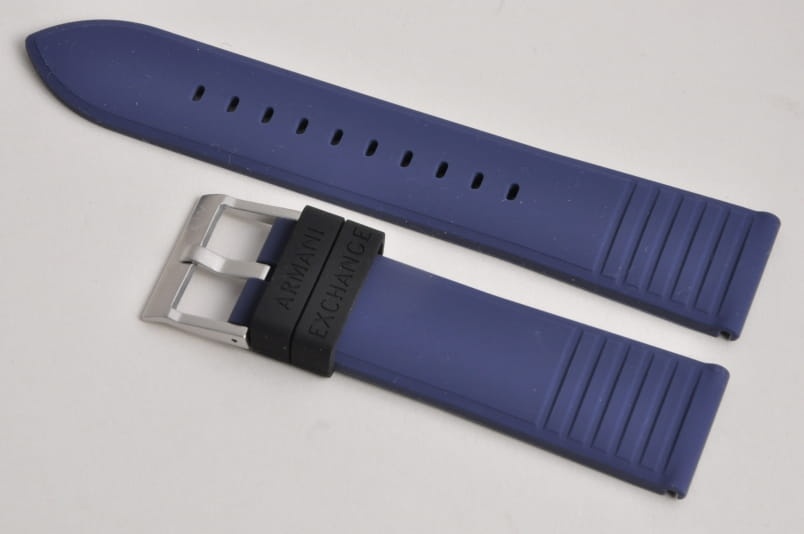 Oryginalny pasek do zegarka Armani Exchange. Wykonany z miękkiego silikonu. Delikatnie żłobiony. Stalowa klamerka, podwójna szlufka. W komplecie teleskopy mocujące.
