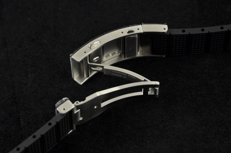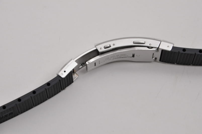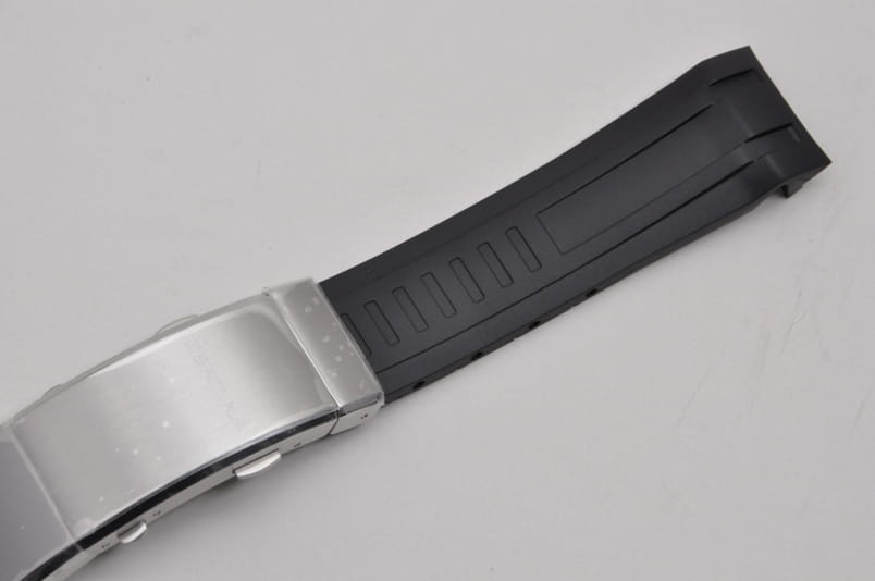 Wykonany z miękkiej gumy w kolorze czarnym. Delikatny wzór na środku paska. Profilowane mocowanie do koperty. Pasek z oryginalnym, stalowym zapięciem na przycisk i wbudowanym mechanizmem przedłużania. W komplecie dwa teleskopy do montażu.