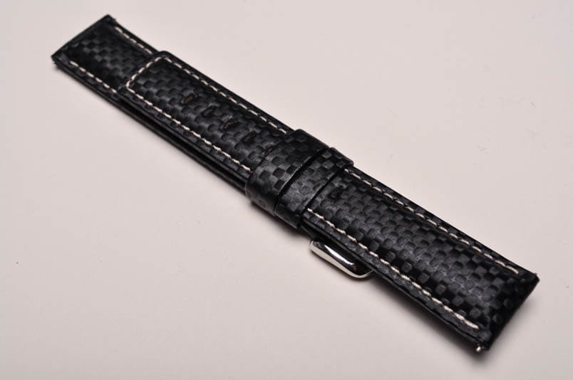 Wodoodporny pasek o sportowym charakterze. Wykonany ze skóry naturalnej o strukturze imitującej włókno węglowe. Futrówka rubberlike - wykonana z miłego w dotyku tworzywa. Przeszywany białą, grubą nicią. Pogrubiany przy mocowaniu do 6mm, dalej pasek cieniowany do 3,9mm. Podwójna szlufka, stalowa klamerka Hirsch Active Design. Długa wersja XL.
