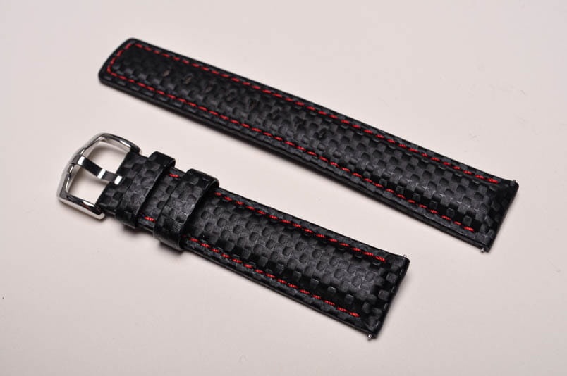 Wodoodporny pasek o sportowym charakterze. Wykonany ze skóry naturalnej o strukturze imitującej włókno węglowe. Futrówka rubberlike - wykonana z miłego w dotyku tworzywa. Przeszywany czerwoną, grubą nicią. Pogrubiany przy mocowaniu do 6mm, dalej pasek cieniowany do 3,9mm. Podwójna szlufka, stalowa klamerka Hirsch Active Design. Wbudowane szybkie teleskopy do szybkiej zmiany.