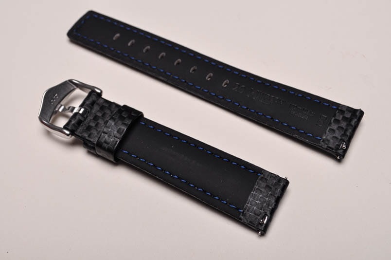 Wodoodporny pasek o sportowym charakterze. Wykonany ze skóry naturalnej o strukturze imitującej włókno węglowe. Futrówka rubberlike - wykonana z miłego w dotyku tworzywa. Przeszywany białą, grubą nicią. Pogrubiany przy mocowaniu do 6mm, dalej pasek cieniowany do 3,9mm. Podwójna szlufka, stalowa klamerka Hirsch Active Design. Wbudowane szybkie teleskopy.
