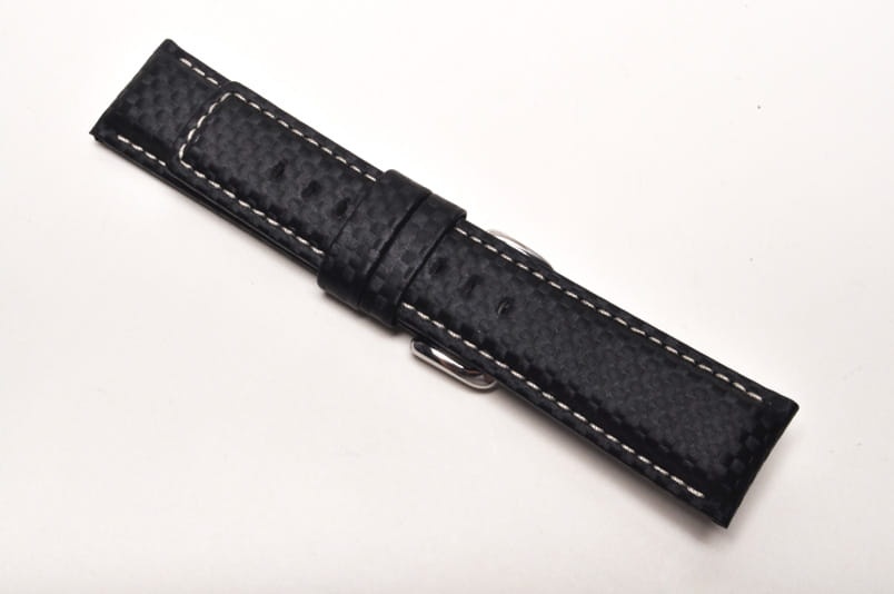 Wodoodporny pasek o sportowym charakterze. Wykonany ze skóry naturalnej o strukturze imitującej włókno węglowe. Futrówka rubberlike - wykonana z miłego w dotyku tworzywa. Przeszywany białą, grubą nicią. Pogrubiany przy mocowaniu do 6mm, dalej pasek cieniowany do 3,9mm. Podwójna szlufka, stalowa klamerka Hirsch Active Design.