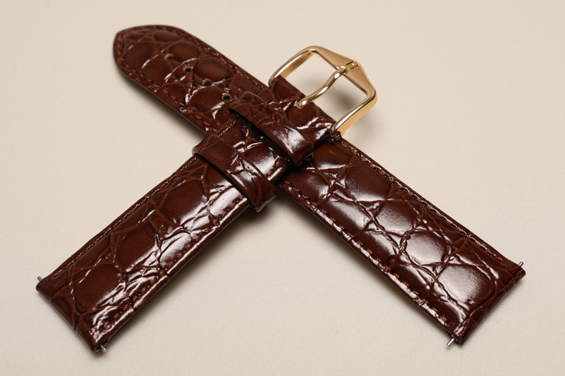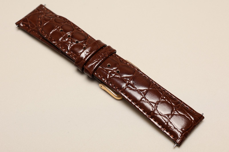 Wykonany z naturalnej skóry cielęcej tłoczonej na wzór skóry krokodyla. Wykończenie na połysk. Futrówka typu Softglove - miękka i miła w dotyku. Przeszywany delikatną nicią ton w ton. Pogrubiany lekko przy mocowaniu do 3,5mm, dalej pasek cieniowany do 2,6mm. Podwójna szlufka, metalowa klamerka.Długość w rozmiarze M. Zamontowane teleskopy szybkiej zmiany ''Quick change''