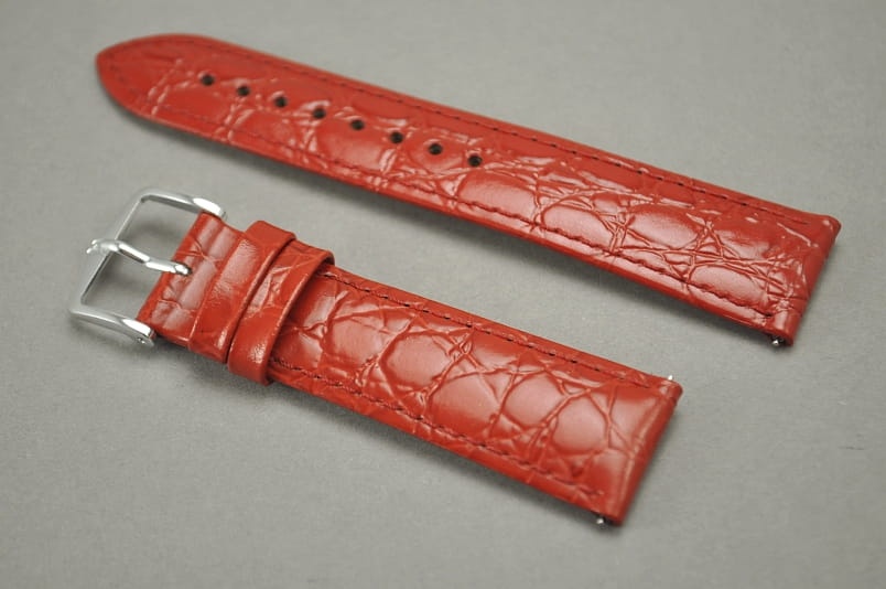 Wykonany z naturalnej skóry cielęcej tłoczonej na wzór skóry krokodyla. Wykończenie na połysk. Futrówka typu Softglove - miękka i miła w dotyku. Przeszywany delikatną nicią ton w ton. Pogrubiany lekko przy mocowaniu do 3,5mm, dalej pasek cieniowany do 2,6mm. Podwójna szlufka, metalowa klamerka.Długość w rozmiarze M. Zamontowane teleskopy szybkiej zmiany ''Quick change''