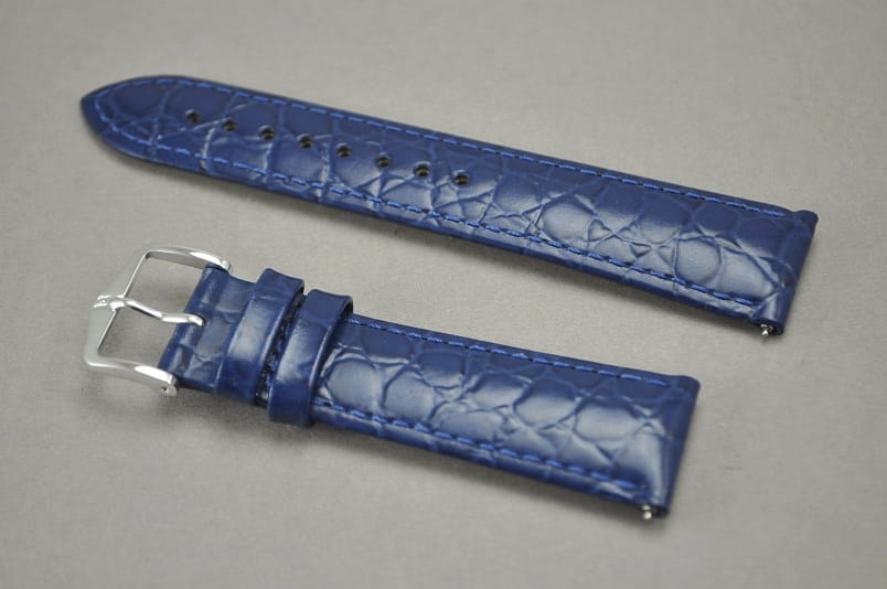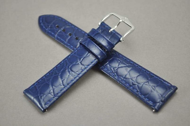 Wykonany z naturalnej skóry cielęcej tłoczonej na wzór skóry krokodyla. Wykończenie na połysk. Futrówka typu Softglove - miękka i miła w dotyku. Przeszywany delikatną nicią ton w ton. Pogrubiany lekko przy mocowaniu do 3,5mm, dalej pasek cieniowany do 2,6mm. Podwójna szlufka, metalowa klamerka.Długość w rozmiarze M. Zamontowane teleskopy szybkiej zmiany ''Quick change''