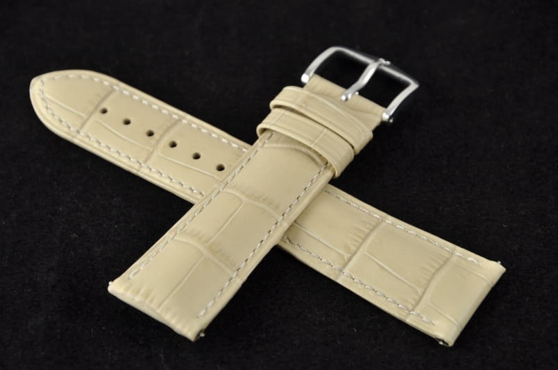 Do dużych zegarków z mocowaniem 20mm. Wykonany ze skóry cielęcej, tłoczonej na wzór skóry aligatora. Przeszywany lekko kontrastową nicią. Pogrubiany przy mocowaniu do 4mm, dalej pasek cieniowany do 2mm. Podwójna szlufka, metalowa klamerka. Wbudowane szybkie teleskopy do łatwiej zmiany. Rozmiar M.