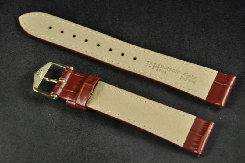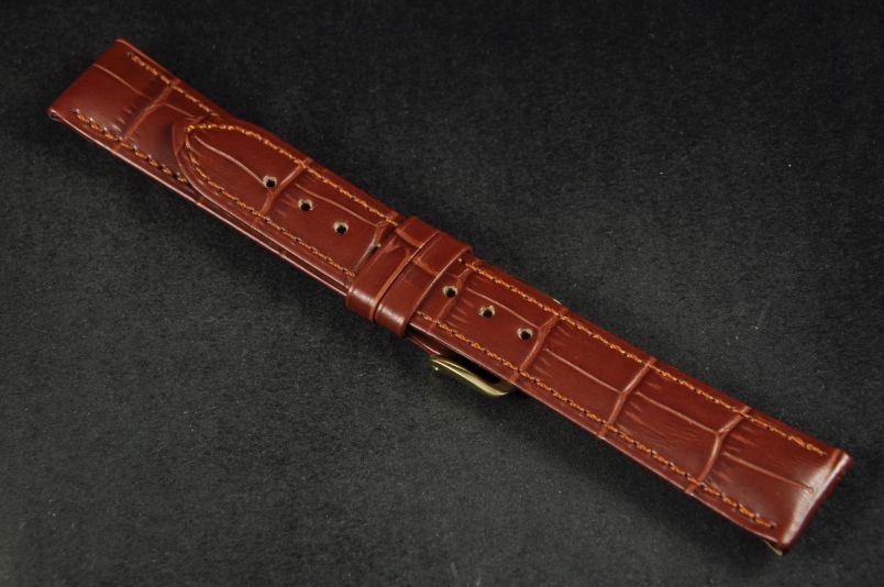 Do dużych zegarków z mocowaniem 18mm. Wykonany ze skóry cielęcej, tłoczonej na wzór skóry aligatora. Przeszywany lekko kontrastującą nicią. Pogrubiany przy mocowaniu do 4,5mm, dalej pasek cieniowany do 2,5mm. Podwójna szlufka, metalowa klamerka. Wbudowane teleskopy do szybkiego, samodzielnego montażu.