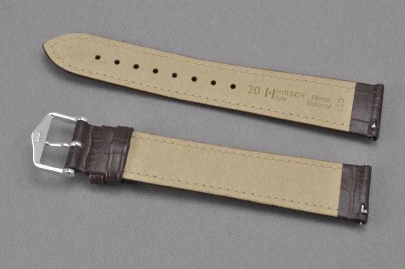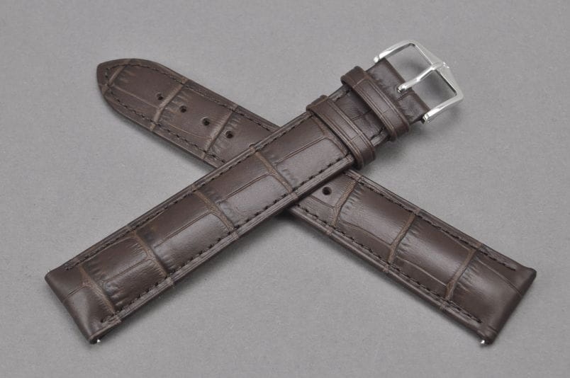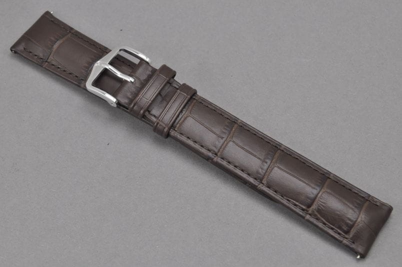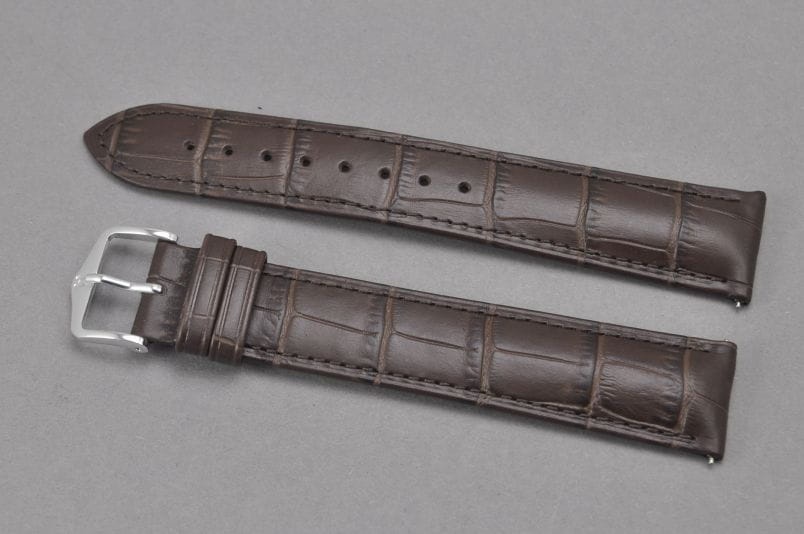Do dużych zegarków z mocowaniem 20mm. Wykonany ze skóry cielęcej, tłoczonej na wzór skóry aligatora. Przeszywany nicią w kolorze paska. Pogrubiany przy mocowaniu do 5mm, dalej pasek cieniowany do 2,5mm. Podwójna szlufka, metalowa klamerka. Wbudowane szybkie teleskopy do łatwiej zmiany. Specjalna dłuższa wersja.