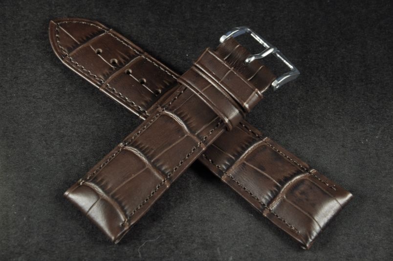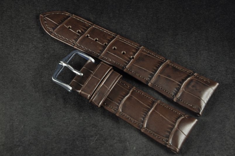Do dużych zegarków z mocowaniem 22mm. Wykonany ze skóry cielęcej, tłoczonej na wzór skóry aligatora. Przeszywany nicią w kolorze paska. Pogrubiany przy mocowaniu do 4,4mm, dalej pasek cieniowany do 2,5mm. Podwójna szlufka, metalowa klamerka. Rozmiar M. Wbudowane szybkie teleskopy.